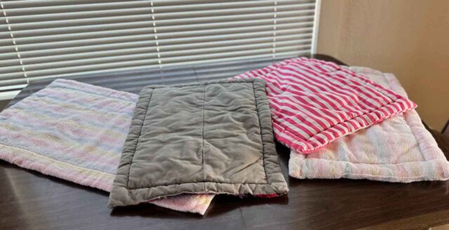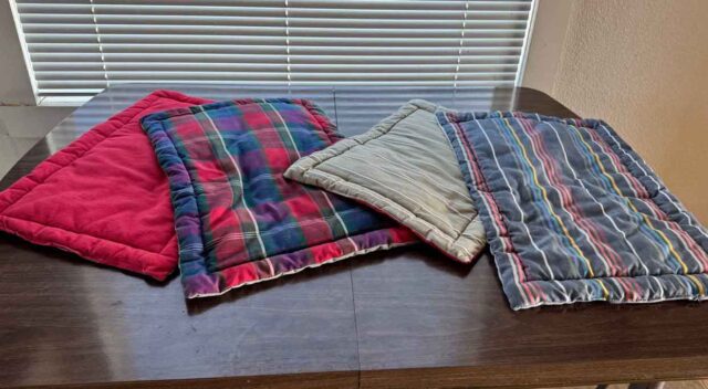 There is a two fold purpose in doing this, besides cleaning out stuff that probably should have been tossed years ago. Animals are getting a nice place to sleep on and it didn’t ended up in the landfill. Of course one day it will, but putting it to use for years to come is a good reason to get out the sewing machine.